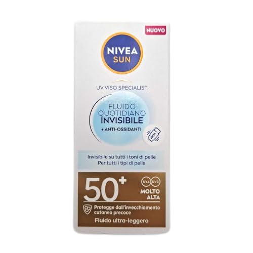 NIVEA SUN Daglig vätska med SPF 50 + 40 ml Ansiktssolskyddsmedel med Hyaluronsyra, Lykokalkon A och Niacinamid, Ultralätt Ansiktssolkräm, Solskydd med matt effekt, Ljus Ton