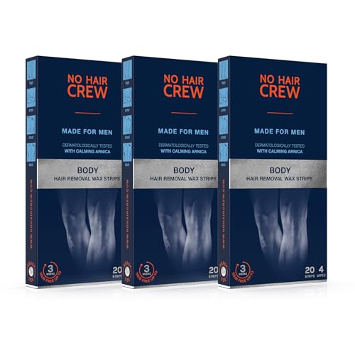 NO HAIR CREW Kallvaxremsor för Män Pack om 3 (60 Remsor + 12 Dukar) – Hårborttagning för Bröst, Rygg och Ben – Slät Hud i upp till 3 Veckor, Snabbt och Effektivt