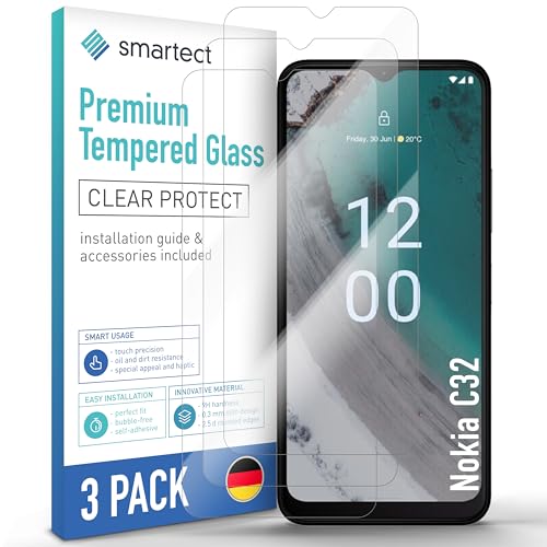 smartect [3 Stycken, Clear] Skärmskydd kompatibel med Nokia C32, HD Screen Protector i Härdat Glas 9H, Bubbelfri Installation, Anti-Fingeravtryck