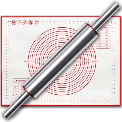 IAGORYUE Kavel med bakmatta, roterande rullstift rostfritt stål för bakning med matkvalitet silikon bakmattor, non-stick degrulle för pizza, pasta, pajskorpa, kaka, glasyr, 43 cm - silver