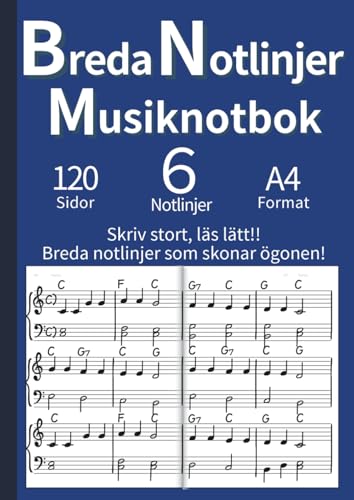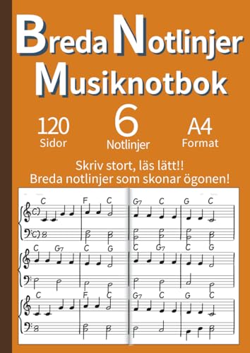 Notisbok för musik | Blankt partitur | Anteckningsbok för musiker | 100 sidor | 8 breda notlinjer | A4-storlek