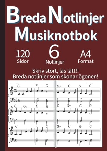 Breda Notlinjer Musiknotbok: Kontinuerliga Notlinjer över Dubbelsidan | Idealisk för Barn, Nybörjare & Seniorer | För Pianolektioner och Komposition | A4 (Vinröd)