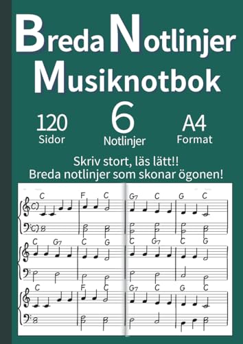 Breda Notlinjer Musiknotbok: Kontinuerliga Notlinjer över Dubbelsidan | Idealisk för Barn, Nybörjare & Seniorer | För Pianolektioner och Komposition | A4 (Grön)