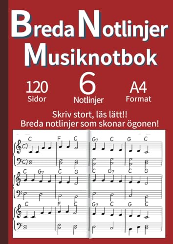 Breda Notlinjer Musiknotbok: Kontinuerliga Notlinjer över Dubbelsidan | Idealisk för Barn, Nybörjare & Seniorer | För Pianolektioner och Komposition | A4 (Röd)