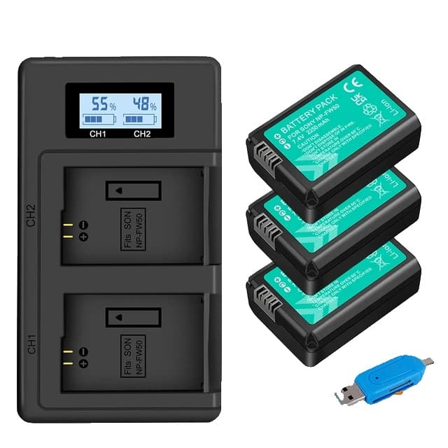 Sony NP-FW50 batteri, LCD dubbel laddare, Kompatibel med Sony Alpha a6500, a6300, a6000, 3 st och laddare