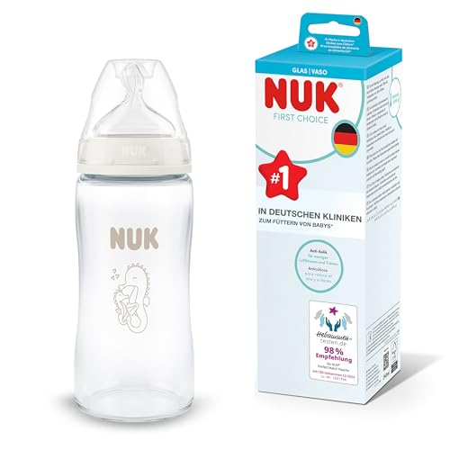 NUK First Choice Babyflaska | 3+ månader | 240 ml | Anti-kolik flaska | Glas | Temperaturkontroll | Sjöhäst | 1 styck