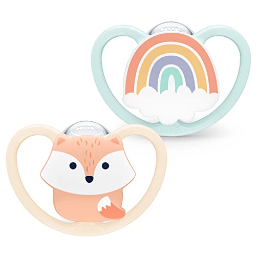 NUK Space napp | napp med extra ventilation | BPA-fri silikon | 0–6 månader | räv och regnbåge | 2 stycken