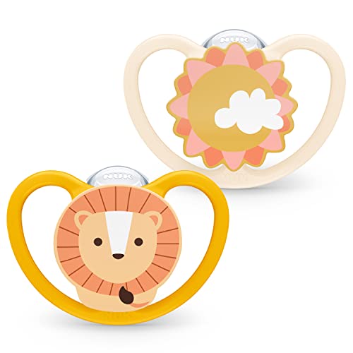 NUK Space napp | napp med extra ventilation | BPA-fri silikon | 6–18 månader | lejon och sol | 2 stycken
