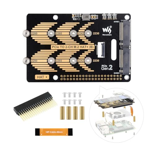 Waveshare PCIe to M.2 Adapter with PoE Function HAT+ (B), Compatible with Raspberry Pi 5, Supports POE NVMe Drive Protocol 2230/2242 / 2260/2280 M.2 Solid State Drive, High-Speed Reading/Writing