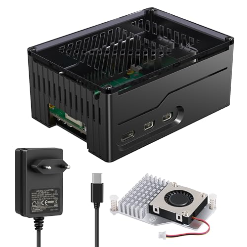 Miuzei Metallfodral för Raspberry Pi 5 Support SSD PCIe M.2 NVMe Hat Key-M Shield Top X1001/X1000/X1003 med officiell aktiv kylare 5,1 V 5A strömförsörjning 27 W