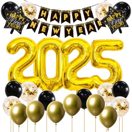 Jxuzh nyårsafton dekoration 2025 ballonger nyår nyårsafton dekoration gott nytt år girlang banderoll svart guld jätte nummer 2025 folieballong Happy New Year folieballong nyårsafton partydekoration