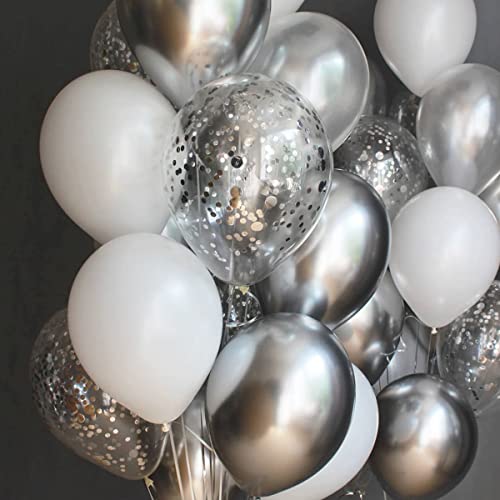 45 Silver och Vita Ballonger Confetti Latex Genomskinlig Ballongdekoration för Nyår, Födelsedag och Graduering Fest