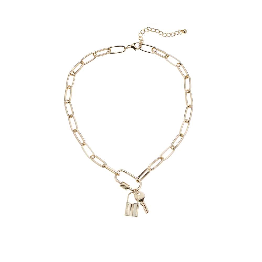 Halsband i guldfärg, hänglås och nyckel som berlock