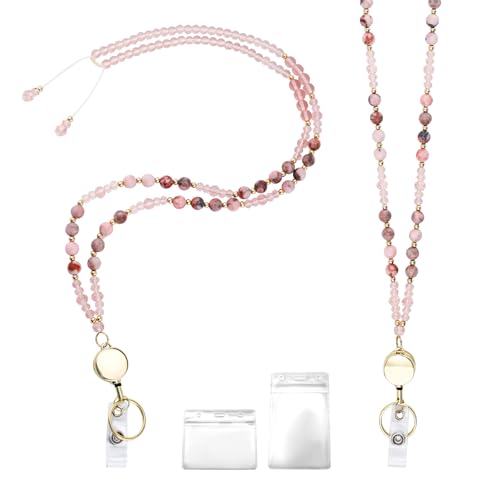 Infällbara Nyckelband för ID-Märken, Naturstenspärlstav Lärarlina med Korthållare Söta Arbetsbrickor för Kort och Nycklar Perfekt för Kryssning Kontor Skola (Rosa)