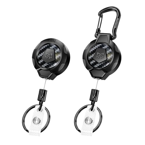 MNGARISTA uppgraderad kraftig infällbar nyckelring, bältesklämma ver. & karbinhake Ver., 10 oz retraktion, 80 cm rostfri stålkabel, 3K kolfiber taktisk ID bricka rulle nyckelkedja indragare, 2-pack