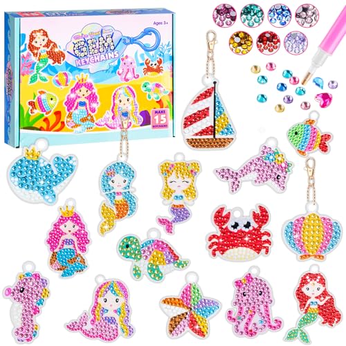 HGRGHH Hantverk flicka 6 7 8 9 10 år, 15 st 5D diamantmålning nyckelring, pyssla din egen GEM-nyckelring, pysselset barn från 6 år, pysselset för flickor 6-12 år