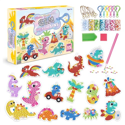 CAYUDEN Diamantmålning nyckelring, 15 stycken gör-det-själv dinosaurier diamantmålning nyckelringsset för barn 5D diamantmålning hänge ädelkonst nyckelring ornament pysselset barn 4 6 8 10 12 år