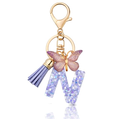 MORSUNBELA Nyckelring med Bokstav Fjäril för Flickor Nyckelring Bokstäver med Initial för Kvinnor,Lila-N