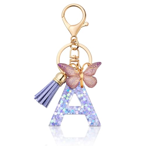 MORSUNBELA Nyckelring med Bokstav Fjäril för Flickor Nyckelring Bokstäver med Initial för Kvinnor,Lila-A