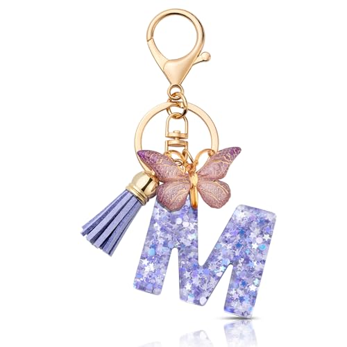 MORSUNBELA Nyckelring med Bokstav Fjäril för Flickor Nyckelring Bokstäver med Initial för Kvinnor,Lila-M