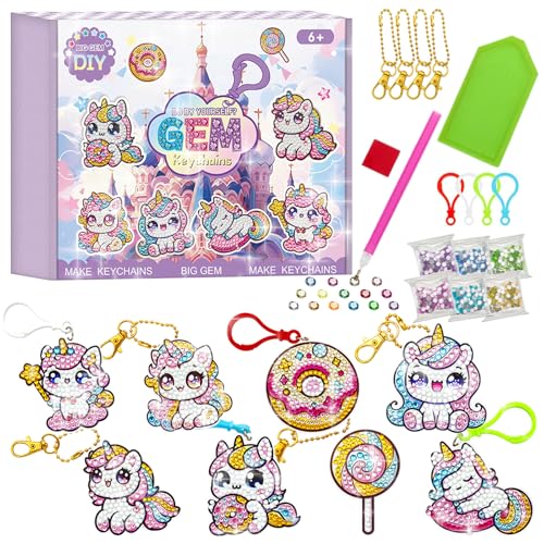 5D Diamantmålning Hänge Set, CAYUDEN 8 Stycken Djur Gör-Det-själv Diamant Nyckelring Enhörning Ornament Diamond Painting Keychain Karikatyr ädelsten Hänge Nyckelringar för Vuxen Kvinna Gem Art Kit