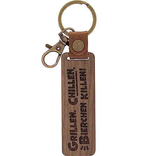 GRUSS & CO nyckelring med grillning i trä | hänge av valnöt med gravyr, chill, ölkillning, inkl. karbinhake | 48347, BRUN, Länge 15 cm