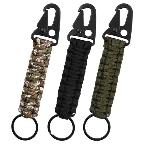 Cozlly Karbinhake nyckelring, 3 delar paracord-nyckelring med karbinhake, flätad nyckelring, för camping, vandring, jakt, fiske, Svart, armégrön, kamouflagegrön, M