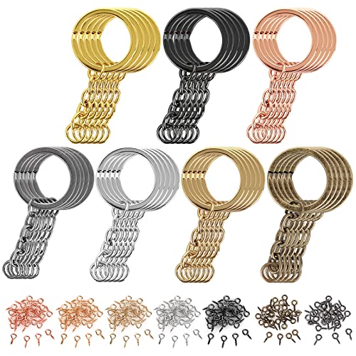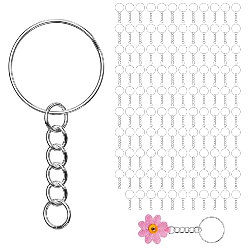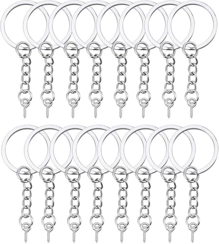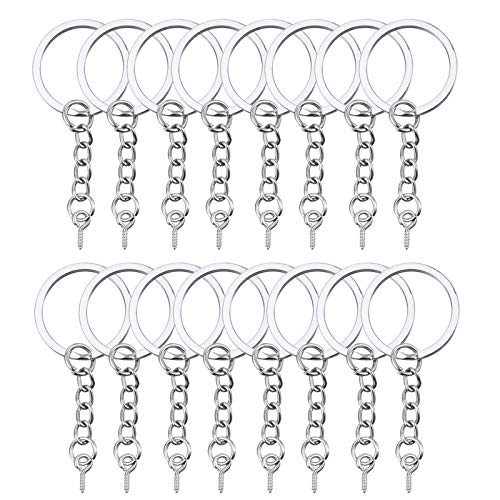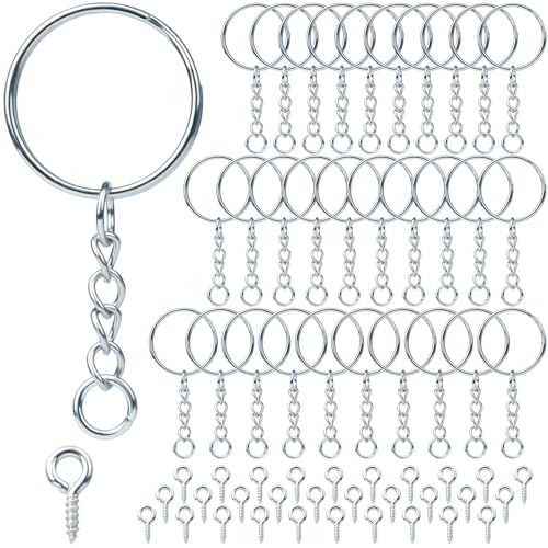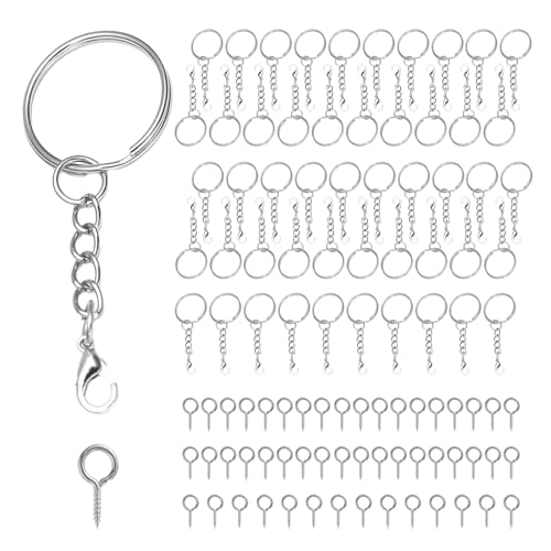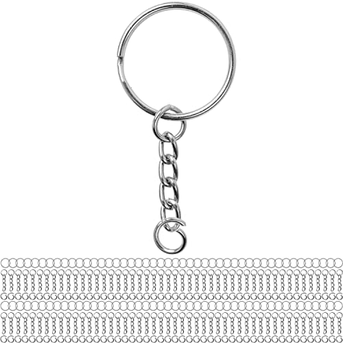 HAUTOCO Nyckelring tillverkningskit, 100 st platta delade nyckelringar ringar (25 mm) med kedja + öppna hoppringar och skruvöglestift, metall nyckelring ringar för hantverk, berlock