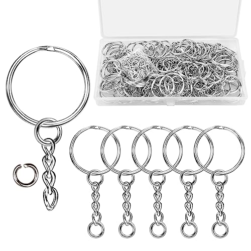 AiQInu 100 st 25 mm nyckelringar med kedja, nyckelring med delad kedja, gör-det-själv nyckelring för nyckelhållare hantverk - silver