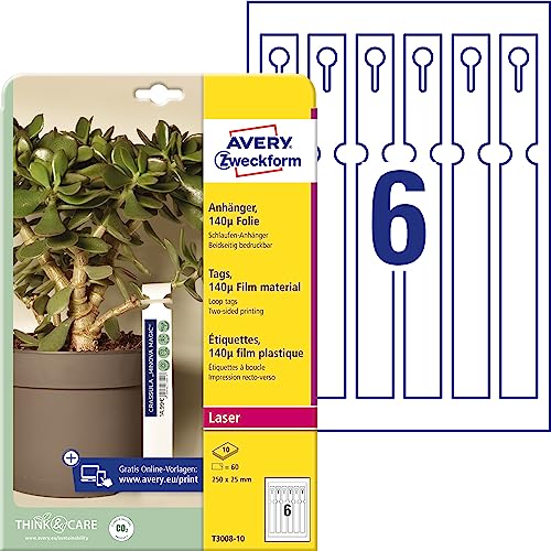 AVERY Zweckform T3008-10 väderbeständiga öglehängen 60 stycken (250 x 25 mm på A4, slingetiketter som kan tryckas på båda sidor, rivtåliga nyckelringar, robust växtextning) folie, vit