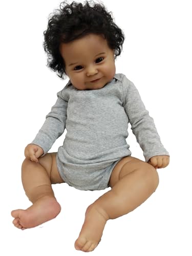 MineeQu 50 cm (20 tum) äkta babystorlek afroamerikanskt handrotat hår nyfödd leende docka ser realistisk, svart hud mjuk viktad kropp återfödd gosig baby presentset med flaska och napp