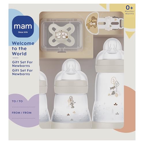 MAM Välkommen till världen set, nyfödd flaskset med 0-2 månader baby lugnande och klämma, nyfödda babypresenter, grå (mönster kan variera)