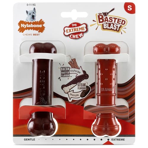 Nylabone, Basted Blast, Extremt stark tuggeffekt, Hundleksak av nylon, Benform, Slitstarkt tuggben, Smak: bacon och biff, Liten, För hundar upp till 11 kg, Förpackning om 2
