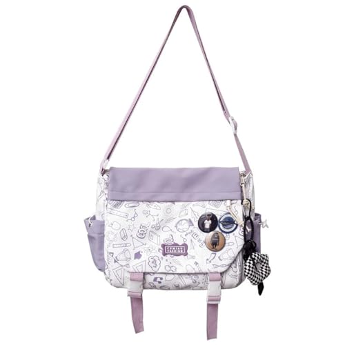 Inshere Aesthetic Crossbody Bag med söta stift och ornament, nylon Y2K Messenger Bag med graffitimönster för kvinnor män lila, lila