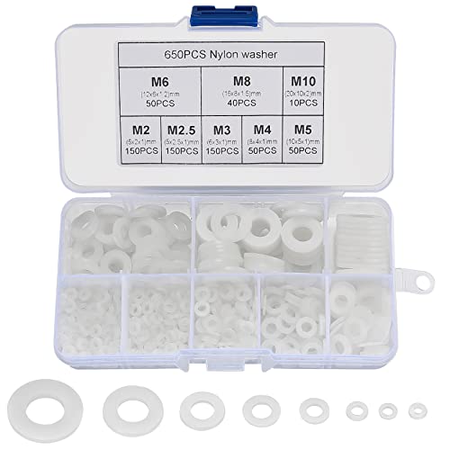 650 st. Nylon Brickor, platta plast karosseribrickor, runda skivbrickor distanser, tätningsbrickor för skruvar isolering - Vit, M2/M2,5/M3/M4/M5/M6/M8/M10