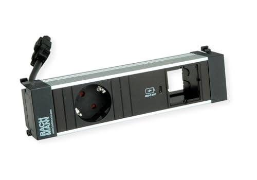 Bachmann Power Frame Uttagslist Small Alu 1Xskyddande Kontaktuttag Svart Med Förbättrat Beröringsskydd 1Xusb C 30W Laddare 1Xcustom Module Tom Strömingång 0,2M H05vv-F3g1,5Mm² Med Gst18-Kontakt, Matningskabel Genom Ändlock Tryckt Bachmann, Förpackad