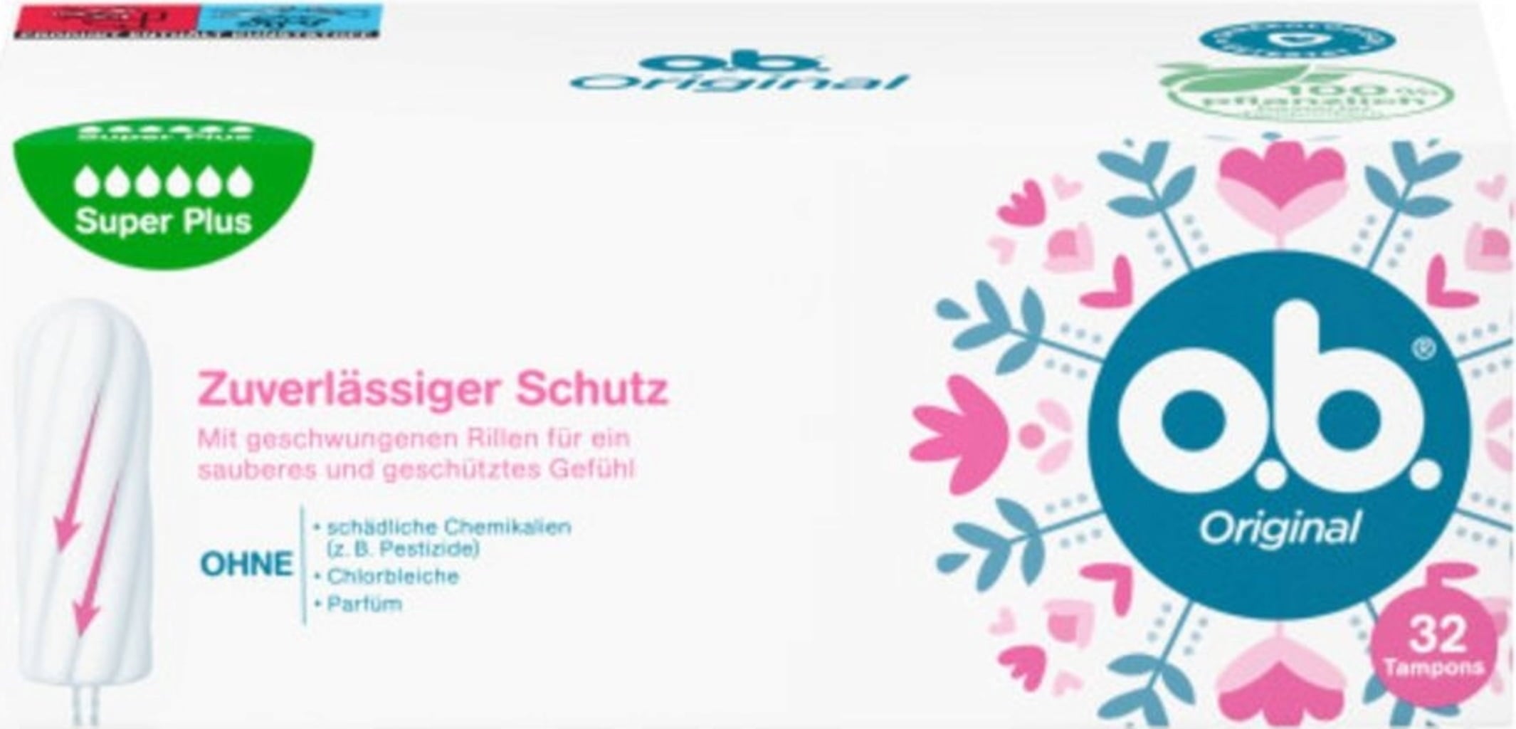 o.b. Original Super Plus, tamponger för mycket starka dagar med StayDry teknik och böjda spår, för tillförlitligt skydd och en ren känsla (1 x 32 stycken)