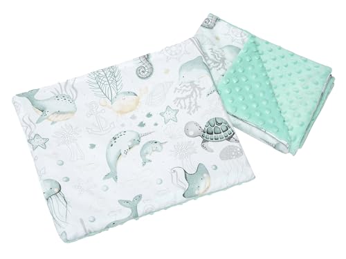 Medi Partners Babyfilt krypfilt med kudde 100% bomull minky barnfilt 55 x 75 + 35 x 30 cm multifunktionell för barnvagn, babystol, vagga (ocean med mint minky)
