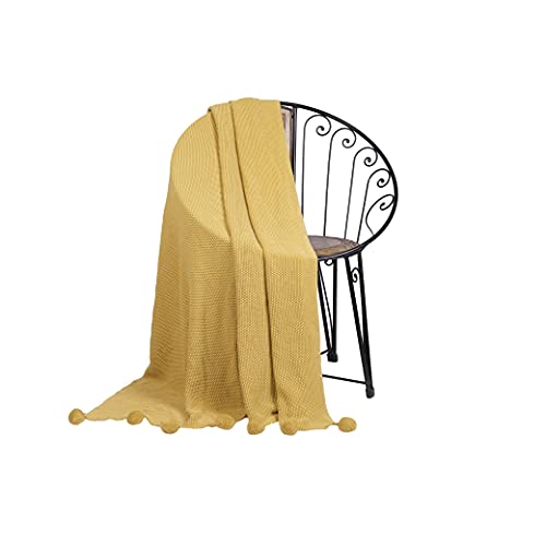 Penguin Home Stickad filt med pompoms 100% bomull – ockra färg – med extra mjuk handkänsla för bäddsoffa och säng – varm och mysig filt – 130 x 150 cm (50 x 60 tum)