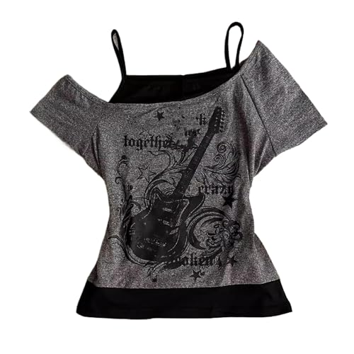 Generisk dam Emo Grunge T-shirt – vintage Y2K Mock tvådelad gitarr grafik baby t-shirt, goth estetik kortärmad off shoulder crop topp, retro street trend punk sommar Harajuku-stil, grå, S