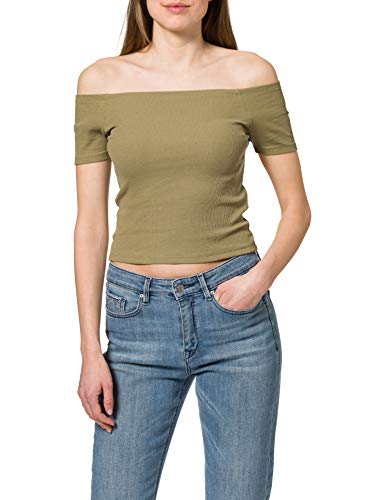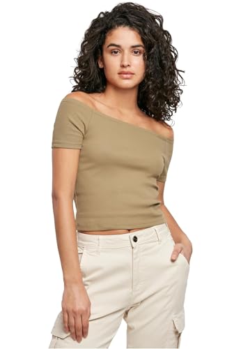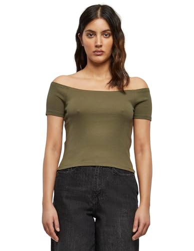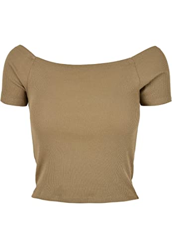 Urban Classics Dam-t-shirt dam, off shoulder-ribbad t-shirt, topp för kvinnor med kort snitt och fria axlar i många färger, storlekar XS – 5XL, kaki, S