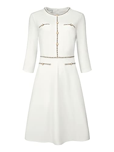 Hobemty Women's 3/4 Sleeve A-Line Dress 2024 Elegant Office Tweed Church Dresses Small White
