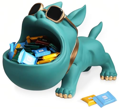 CUZOKOLA Large Size Cute French Bulldog Gifts Statue Animal Blue Turquoise Dog Candy Dish Modern Candy Bowls for Office Desk Big Mouth Storage Resin Figurine for Home Decor with Gold Glasses Frame Key