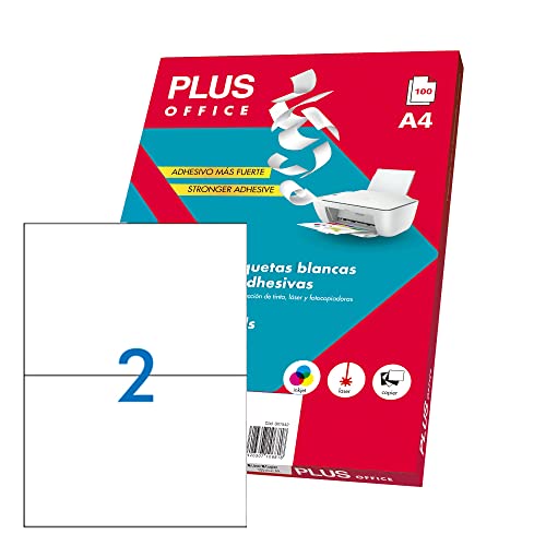 Plus Office - Vita självhäftande etiketter för utskrift, paket med 100 ark A4-ark självhäftande klistermärken för bläckstråleskrivare, laser och kopiatorer, 2 etiketter per ark (210 x 148 mm)