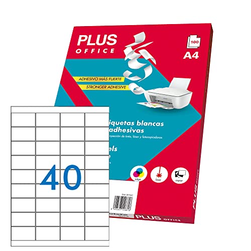 Plus Office - Vita självhäftande etiketter för utskrift, paket med 100 ark A4-ark självhäftande klistermärken för bläckstråleskrivare, laser och kopiatorer, 40 etiketter per ark (52 x 30 mm)