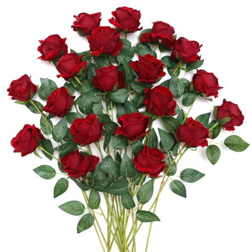 JUSTOYOU 20 st Bourgogne röd ros konstgjord blomma, silke blommande ros med stjälk, konstgjord rosbukett realistisk blomma för Home Table Office Party bröllop trädgård arrangemang (vinröd)
