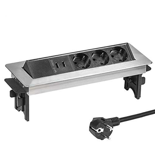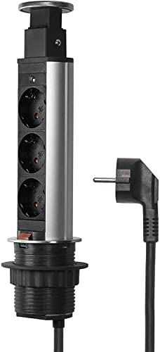 Elbe Inno Retractable Table Socket 2xUSB, 3-Way Socket Strip, Built-in Socket Multi-Outlet, Children's Safety Equipment, Chrome Plated Appearance, Semi-Automatic Lid, 1.5 m Cable, for Office, Workshop, Kitchen
