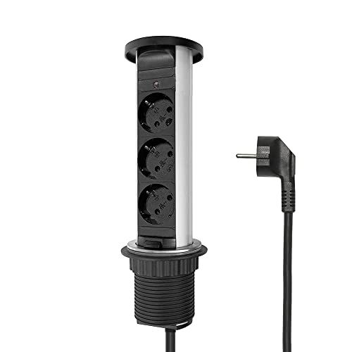 Elbe Inno Retractable Table Socket 3 Way, Waterproof Table Socket Strip with Child Cover, Built-in Socket with 1.5 m Connector Cable, Socket Strip, Ideal for Office, Kitchen and Workshop