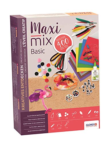 GLOREX 6 1214 074 – kreativ – maxi – mix basic, pysselblandning bestående av 400 delar, med mossgummi, poms, chenilletråd, fjädrar, rocailler och vinglande ögon