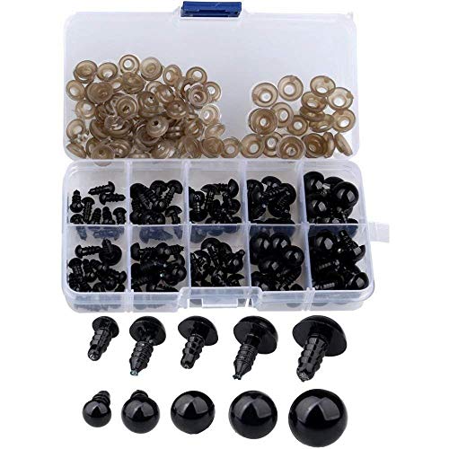 byou Säkerhetsögon i plast för mjukisdjur, 142 delar i 6 till 12 mm, svarta enfärgade ögon med brickor i förvaringslåda för nallebjörn, docka och hantverk